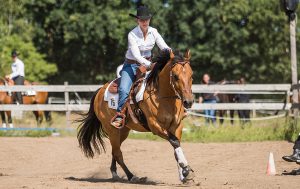 Auf das Westernreiten bin ich vor ca. 13 Jahren umgestiegen, was ich auch keinen Moment bereue. Ich starte in der LK 3 in der SSH, WHS, TH und RR. Ich habe zwar eine eigene Stute, reite auf Turnieren aber den Wallach von meinem Mann Andreas, weil es das ruhigere und zuverlässigere Pferd ist.
