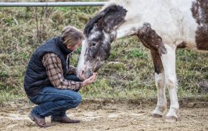 Haltung: Die artgerechte Haltung sollte man als essentiellen Bestandteil möglichst zeitig in die Therapie mit einfließen lassen. Ein artgerechtes Leben sieht im ganz ursprünglichen Sinn vor, dass ein Pferd in der Steppe bis zu 18 Stunden täglich mit Fressen beschäftigt ist. Dadurch ist das Pferd immer in einer langsamen, stetigen Bewegung. Dadurch legen Pferde bis zu 20 km zurück – und zwar täglich. Auch sind Pferde Herdentiere, für die es ein ausgeprägtes Bedürfnis ist, mit ihren Artgenossen in Sicht-, Geruchs- und Blickkontakt zu sein. Körperkontakt unter Pferden ist für den Erhalt des seelischen Gleichgewichts unbedingt zu ermöglichen. Ob Stallhaltung mit täglichem Koppelgang, eine Außenbox mit Paddock, Gruppenhaltung oder ganzjährige Weidehaltung mit Schutzhütte den perfekten Lebensraum bieten, hängt immer auch von den Präferenzen und bisherigen Erfahrungen des jeweiligen Pferdes ab und gilt es zusammen mit dem Halter zu eruieren. Das Verhalten des Pferdes wird sich relativ schnell positiv verändern, wenn die Haltung zu seinen Gunsten verbessert wird. Die Haltung stellt einen sehr wichtigen Punkt der Therapie dar, da sie die Basis für jeden weiteren Behandlungsschritt legt und Balance und Ruhe geben soll.