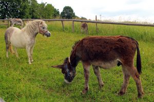 Der Esel ist weniger territorial als das Pferd und ficht kaum Rangkämpfe aus. Für viele Pferde kann ein Esel ein beruhigender Freund werden, da Esel bei Gefahr kaum nervös werden und Ruhe in die Gruppe bringen. Esel sind sehr genügsam was ihr Futter betrifft, sie fressen sogar Disteln und Geilstellen, bei denen die Pferde die Nase rümpfen. Ideal also für die Koppelpflege. Fette Weiden sind allerdings nichts für Esel, da sonst Hufrehe und Kreuzverschlag drohen. Nachteil der Esel sind die extrem lauten Stimmen – man hält sie also besser nicht in einem dicht bewohnten Gebiet.
