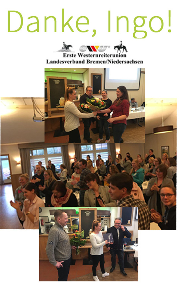 Ingo ist seit 1989 Mitglied der EWU Erste Westernreiter Union Deutschland e. V., seit 1998 Richter und Prüfer und seit 2016 1. Vorsitzender des Landesverbandes Bremen/Niedersachsen. Ingo übergab auf der Jahreshauptversammlung sein Amt an Claudia , seit 1998 Richter und Prüfer und seit 2016 1. Vorsitzender des Landesverbandes Bremen/Niedersachsen. Ingo übergab auf der Jahreshauptversammlung sein Amt an Claudia Wünschenmeyer.