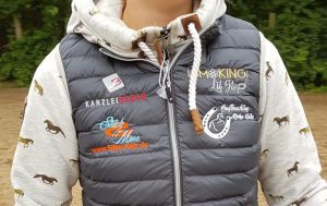 Wie auf den Bildern zu sehen ist, handelt es sich hierbei um hellgraue Westen, auf denen außer dem Verbandslogo die Sponsoren des Landesverbands in unterschiedlichen Farben abgebildet sind. Auf den Bildern trägt die liebe Jessi die Weste in der Damengröße M, sie fällt normal aus. Die Westen sehen nicht nur super schick aus, sondern sind auch aus einem angenehmen Material.