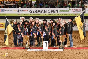 Ein Dèjà-vu Erlebnis? Aber hallo! Dass beide Kader dieses Jahr gut aufgestellt sind, war allen klar. Aber wie jeder weiß heißt das ja noch lange nicht, dass man damit automatisch eine Medaille holt. Und einen Doppelsieg anzupeilen – das ist schon eine Ansage. Eine Portion Glück gehört schließlich auch immer noch dazu, und das fehlt beiden Teams in diesem Jahr offensichtlich nicht. Zwischendurch lag man nach Trail, Western Horsemanship und Western Pleasure sogar mit acht Punkten vorne. Mit zwei Punkten Vorsprung sind es am Ende Johanna Neuhäusser, Joschka Werdermann, Nina-Bianca Obermüller, Alina Wandelt, Alina Stepper, Isabel Roth und Silke Woitaschek, die die begehrten Medaillen und Schärpen umgehängt bekommen.
