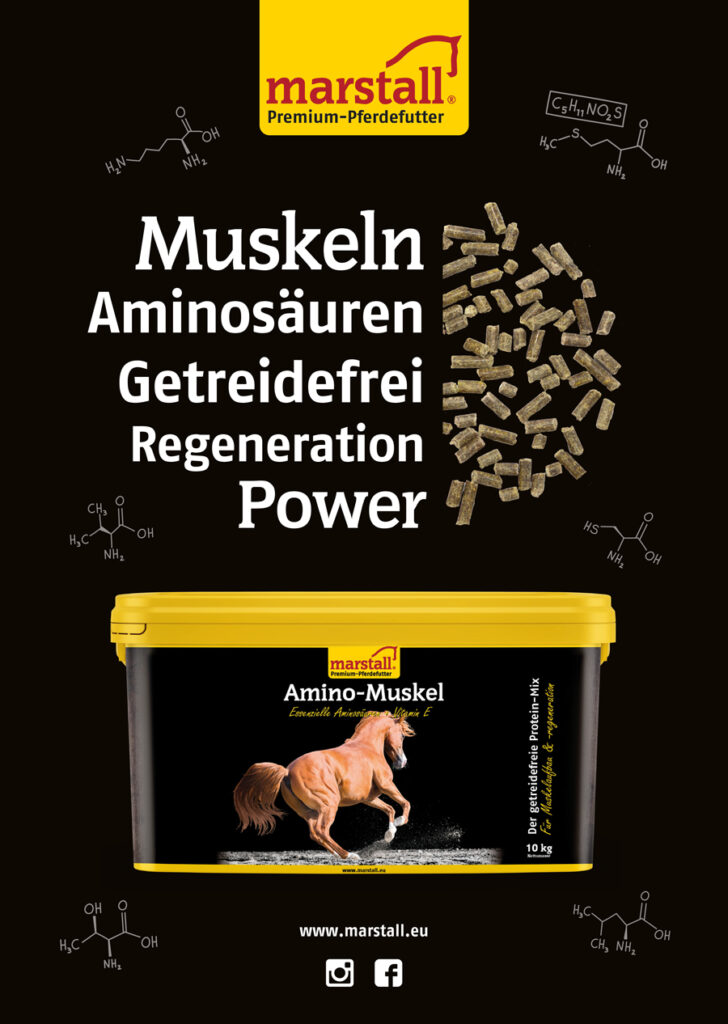 marstall Amino-Muskel versorgt in konzentrierter Form Sport- und Freizeitpferde mit essenziellen Aminosäuren (ohne Soja) und Vitamin E als Antioxidans. Es fördert einen raschen Muskelaufbau und eine verkürzte Regenerationsphase. Dank der getreidefreien Rezeptur ist es für alle Pferde geeignet.
